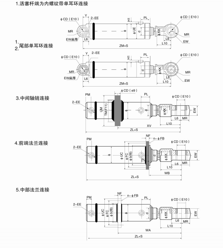 2:缸頭、缸筒連接方式 1=缸頭耳環帶襯套;2=缸頭耳環帶關節軸承;3=鉸軸(用于缸徑≥80卡鍵式連接);4=端部法蘭(用于缸徑≥80卡鍵式連接);5=中部法蘭(用于缸徑≥80卡鍵式連接)